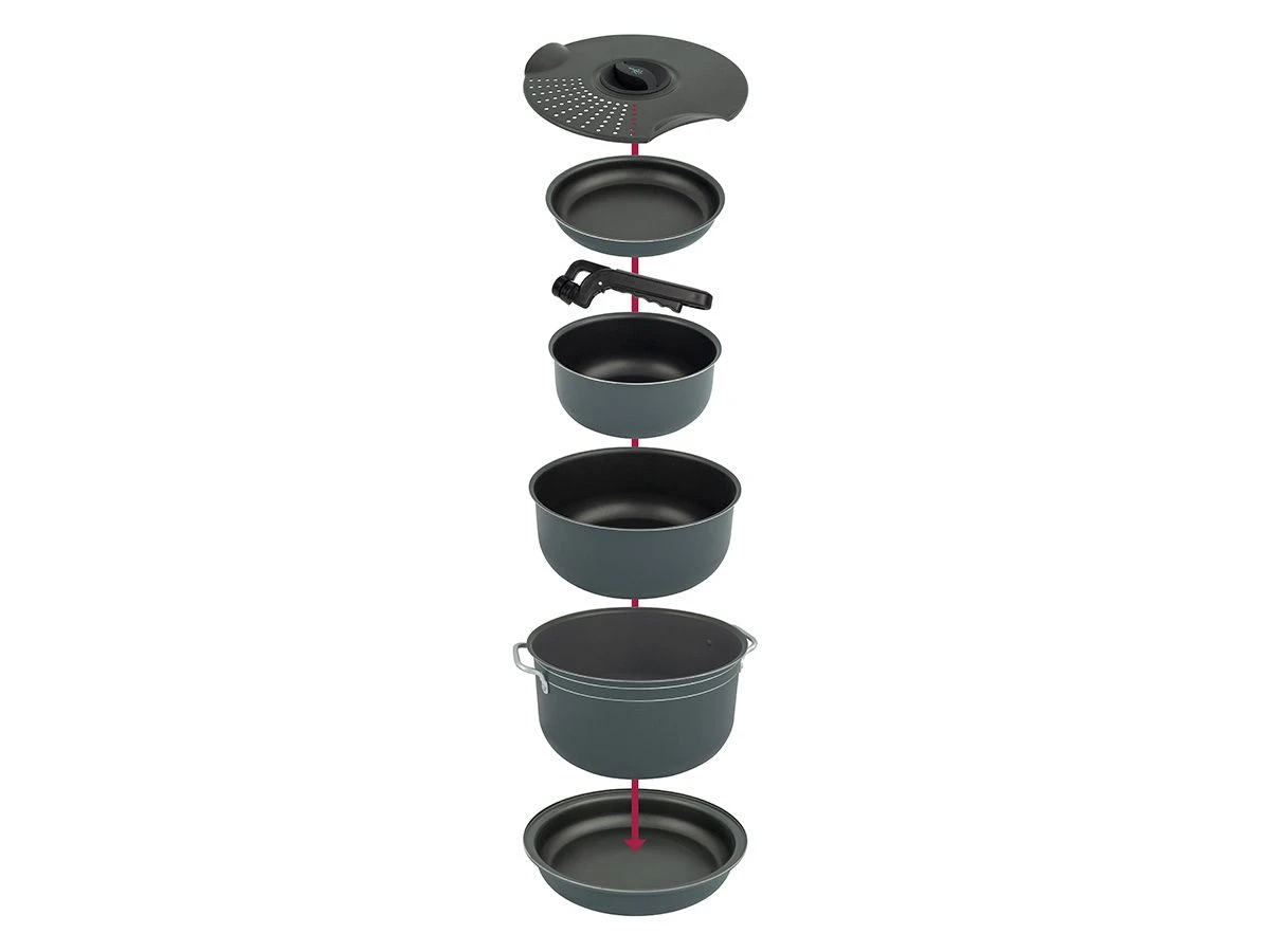 Dieses leichtes Topfset von Bo-Camp besteht aus 3 Töpfen, 2 Pfannen, 1 Topfdeckel und 1 Universalgriff. Die Aluminiumtöpfe haben eine Pulverbeschichtung auf der Außenseite und eine Antihaftbeschichtung auf der Innenseite.