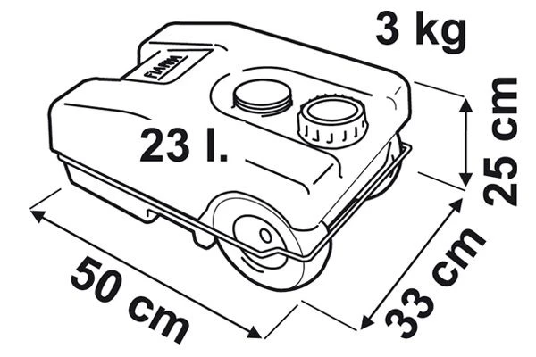 Praktischer und tragbarer Abwassertank von Fiamma mit einem Volumen von 23 Litern und einer praktischen Abflusskappe.