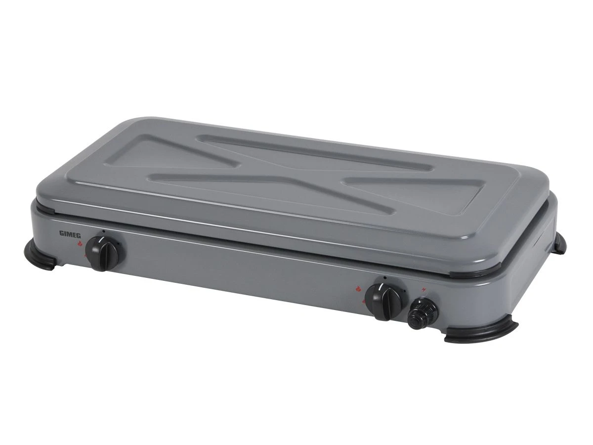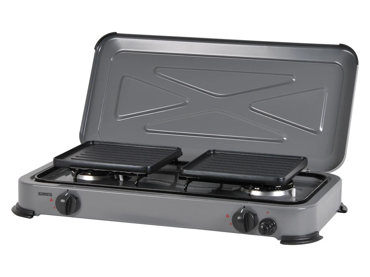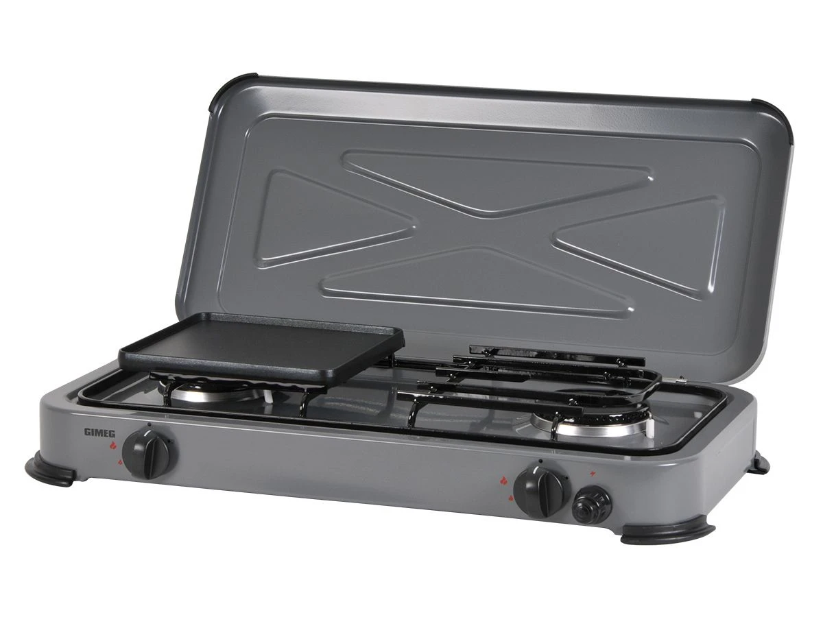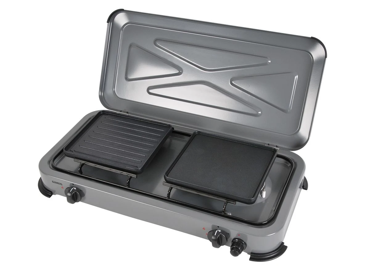 Ein Kocher auf dem Sie kochen, grillen und backen können? Das können Sie auf diesem 2-Flammen Duogrill von Gimeg. Dieser Kocher ist ausgestattet mit einem stabilen Pfannenträger der ausreichend Platz für zwei große Pfannen bietet. Außerdem werden zwei reversible Backbleche zum Backen oder Grillen mitgeliefert. Die Brenner können unabhängig voneinander und gleichzeitig eingesetzt werden. Sie können zum Beispiel Wasser kochen und gleichzeitig Fleisch braten.