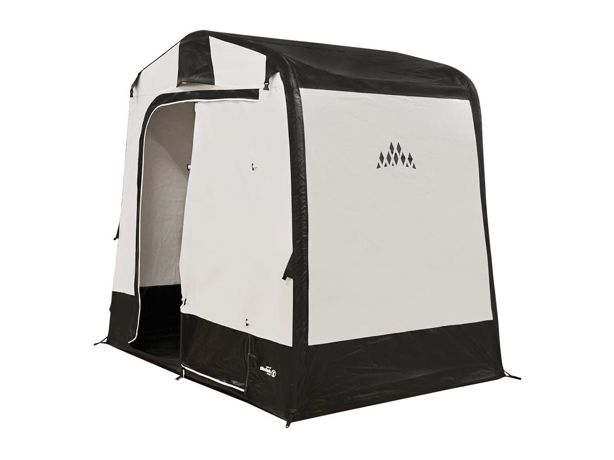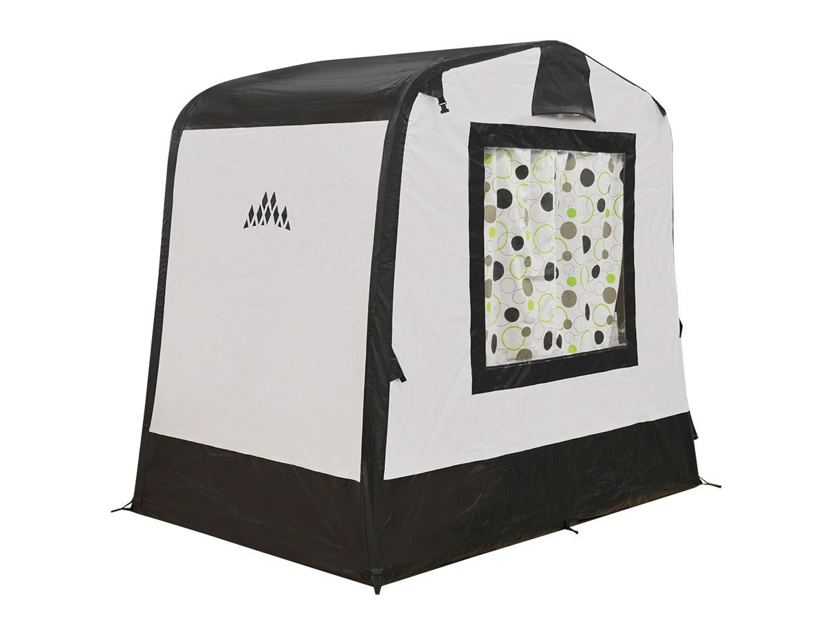 Dank des festen PVC-Bodens haben Regenwasser, Zugluft und Ungeziefer keine Chance, ins Zelt zu gelangen. So können Sie Ihr Campingzubehör sicher unterstellen, sodass es geschützt steht. Mit einer Grundfläche von ca. 3,5 m² haben Sie genügend Platz für Fahrräder, Grill und andere Gegenstände. Die große halbrunde Tür kann zur Seite gerollt werden. Die umklappbare Schwelle erleichtert den Einstieg ins Zelt. Der First hatfür eine gute Luftzirkulation vorne und hinten eine permanente Lüftungsöffnung. Das große Fenster auf der Rückseite sorgt für viel Licht. Für zusätzliche Privatsphäre kann das Fenster von innen mit den mitgelieferten Vorhängen abgedeckt werden.