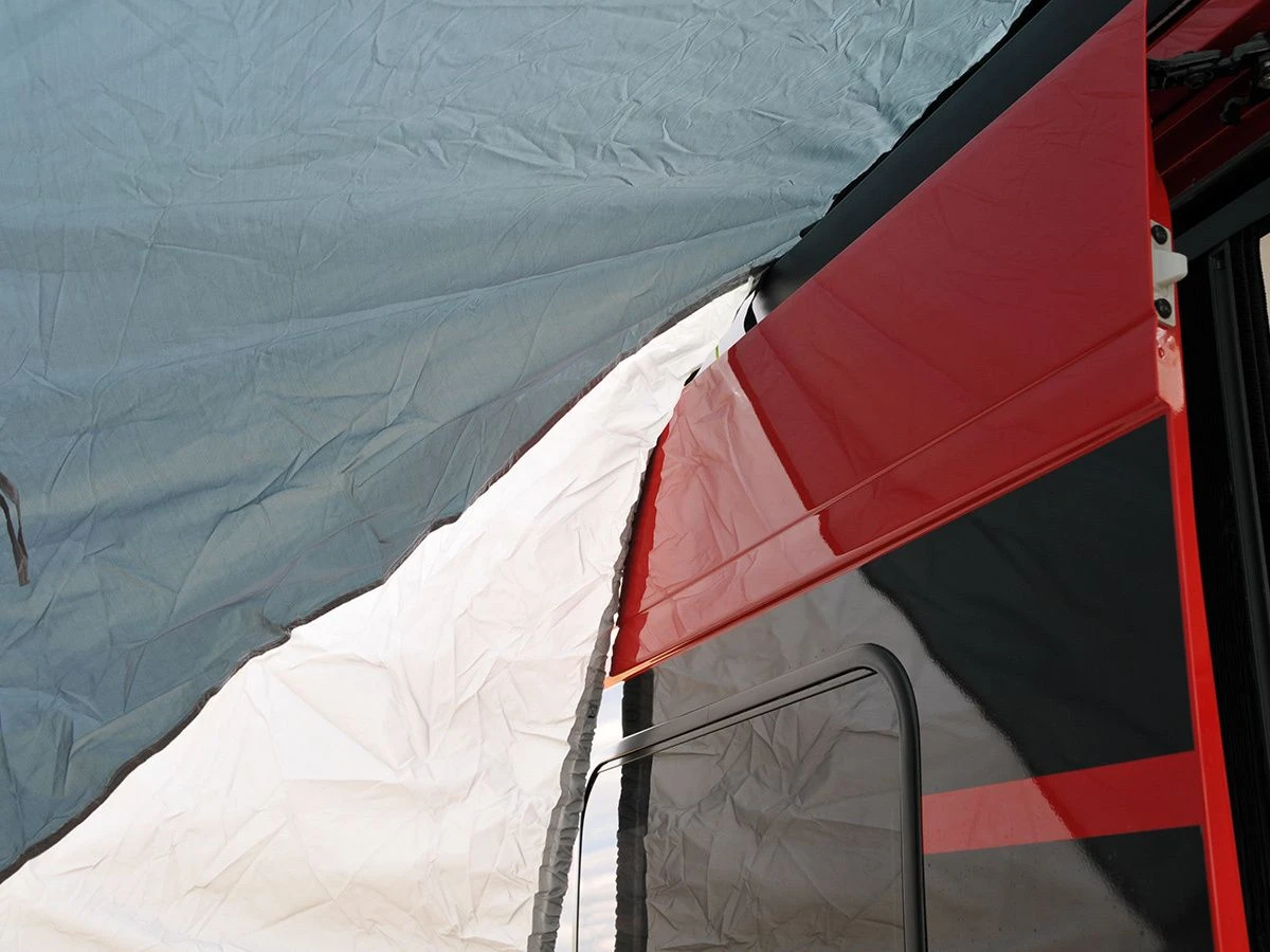 Die Rückwand dieses Buszeltes kann in zwei Teilen zur hin Mitte aufgerollt werden. Wenn beide Teile aufrollen sind, haben Sie fast die gesamte Rückwand als Durchgang zum Fahrzeug frei. Wenn Sie mit dem Fahrzeug unterwegs sein wollen, können Sie die Schleuse auch aufrollen und so sichern.