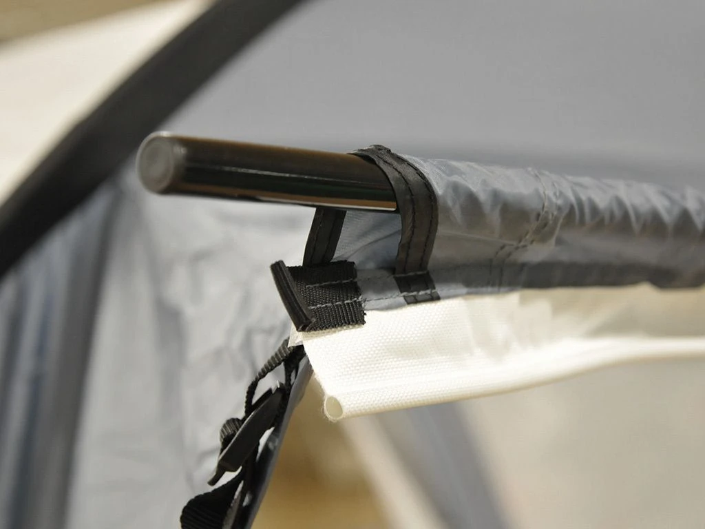 Die Befestigung des Trinity ist ein Kinderspiel. Die Verbindungslasche am Heck des Zeltes kann mit nur zwei Abspannleinen über das Dach Ihres Busses gezogen werden und auf der anderen Seite mit einem Hering gesichert werden. Wenn Ihr Bus mit einer Regenrinne versehen ist, dann können Sie die Verbindungsklappe einfach mit der mitgelieferten Stange und den Klemmen an der Regenrinne befestigen. Wenn Ihr Bus aber mit einer Zeltstange ausgestattet ist, dann können Sie den Keder der Verbindungsklappe auch direkt in die Zeltschiene schieben. Möchten Sie das Trinity noch schneller und einfacher befestigen und abbauen? Dann entscheiden Sie für die optionalen Saugnäpfe oder den Magnetadapter.