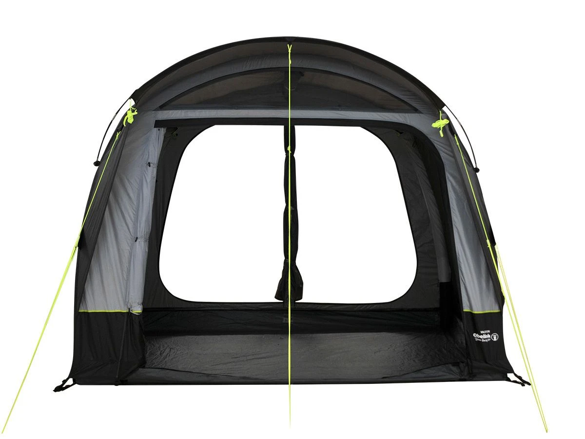 Das Anbringen des Obelink Vacation Easy Air ist sehr einfach. Die Schleuse auf der Rückseite des Zeltes kann mit nur zwei Abspannseilen über das Dach Ihres Vans gezogen werden. Befestigen Sie diese mit Erdnägeln auf der anderen Seite. Eine andere Möglichkeit besteht darin, die Flappe der Schleuse an einer Dachrinne zu befestigen, für die an mehreren Stellen Klettverschlüsse angenäht wurde.