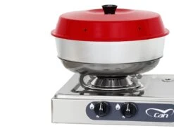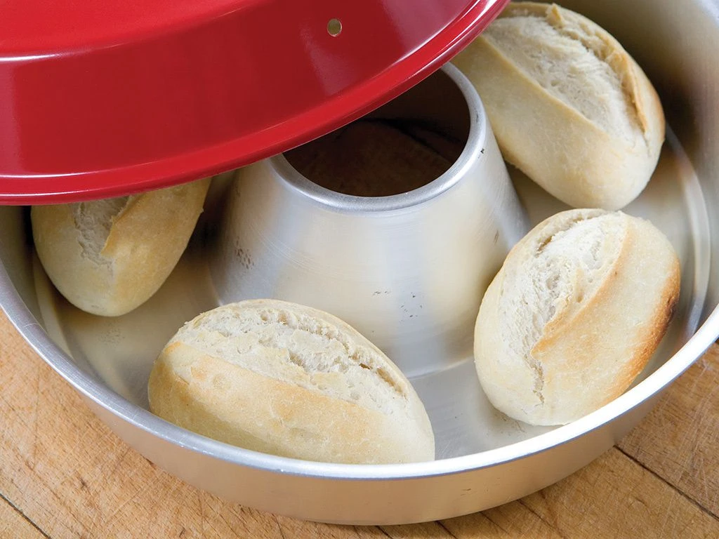 Die Pfanne besteht aus 3 Teilen, einem Edelstahlboden, einer Backform aus Aluminium und einem rot lackierten Deckel mit kleinen Dampfauslässen. Diese Teile werden immer zusammen verwendet und sorgen für eine Ober- und Unterhitze, genau wie bei einem normalen Ofen. Der Omnia kann auf allen Arten von Kochgeräten verwendet werden, mit Ausnahme eines Induktionsherds.